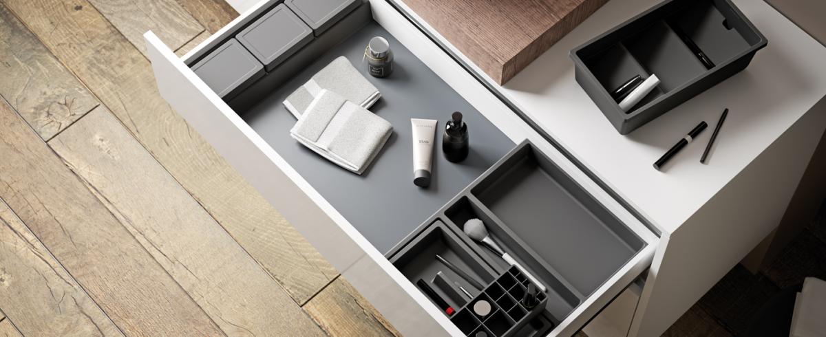 Each grid can be equipped with tissue box, small tray, cosmetic holder and small boxes with lid (the selection of accessories varies according to the combination of widths and depths).