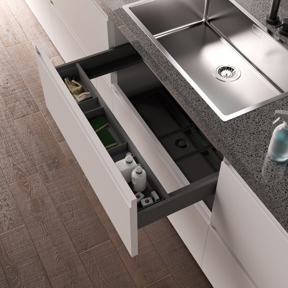 Struttura autoportante in alluminio verniciato. Studiato per i sistemi cassetto Blum Legrabox®, Blum Tandembox®, Grass NovaPro®. Disponibile in varie altezze. Adattabile ai vari tipi di largezze e di profondità. Dotato di vaschette removibili. Particolarmente adatto per abbinamenti con raccoglitori della Collezione Première e Sistema 9XL.