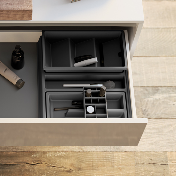 Gli accessori per cassetto della Linea ONDA sono ideali per organizzare al meglio i cassetti del mobile bagno.