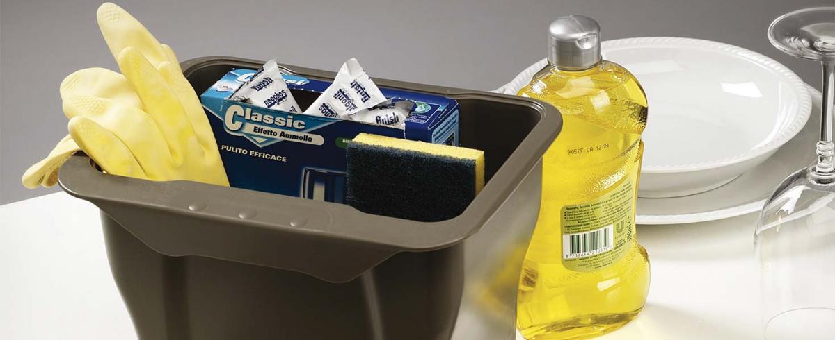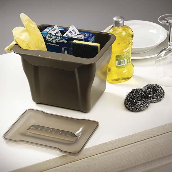 Il raccoglitore Art. 557 è un pratico contenitore in plastica dotato di coperchio ideale per organizzare detergenti, spugne e piccoli oggetti.