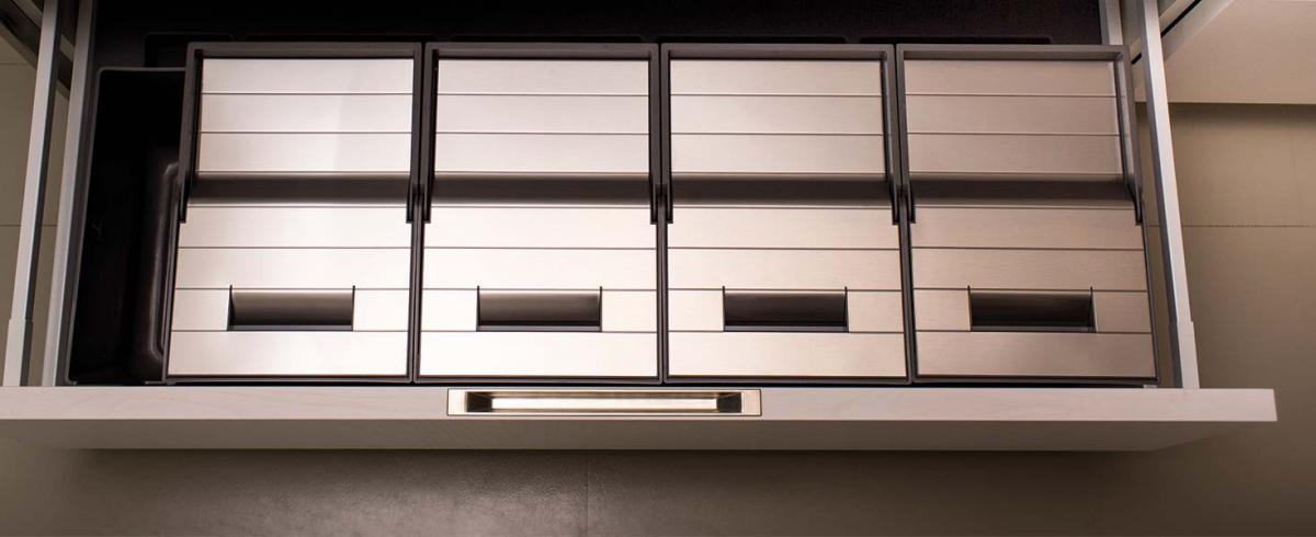 Il vassoio che ospita i secchi è rifilabile a misura e per le profondità maggiori sono disponibili compensatori di profondità in acciaio inox.