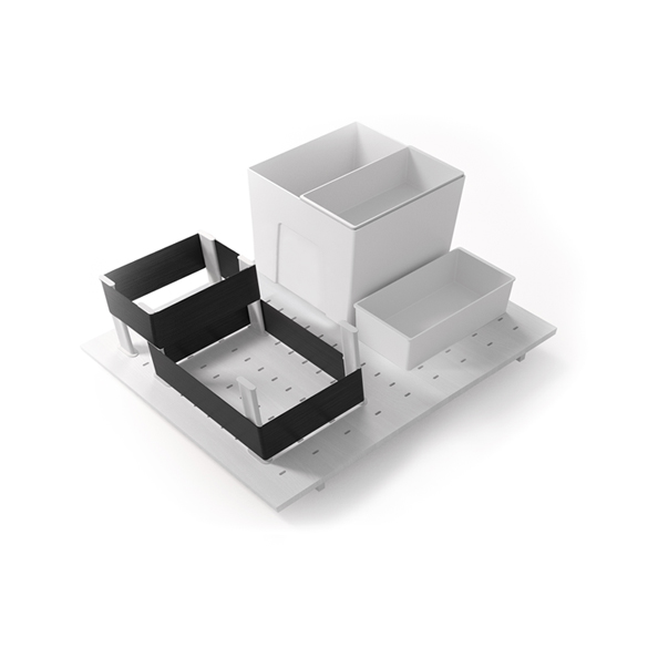 Art. 1325: organizzatore di spazio per cestone con fondo in legno forato, dotato di 8 elementi divisori, 2 fasce eleastiche e 3 scatole multi-uso removibili.